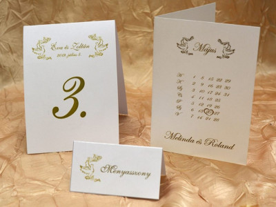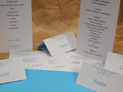 Esküvői meghívója mellé elkészítjük a menükártyát, ültetőkártyákat hajtogatott változatban vagy gravírral kivágott kis figurával, akár fából-plexiből kivágva. Nagyméretben kinyomtatjuk az ültetési rendet. Meghívott vendégeknek kisebb ajándékokat készítünk: névre szóló kis dobozka csokinak, saját hűtőmágnes az alkalomról.